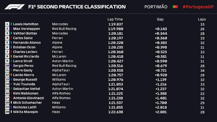 Μοναδικό πρόβλημα κατά τη διάρκεια του FP2 ήταν μια προσωρινή διακοπή για τον Μαξ Φερστάπεν καθώς παρουσιάστηκε ένα θέμα με το σύστημα πέδησης του μονοθεσίου, ωστόσο δεν ήταν κάτι το σημαντικό και επιδιορθώθηκε γρήγορα, οπότε επέστρεψε στην πίστα. Παρακάτω ακολουθούν οι χρόνοι και η κατάταξη από τη δεύτερη περίοδο των ελεύθερων δοκιμαστικών της Formula 1 στο Πορτιμάο.