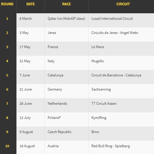 Η Dorna λέει ότι θα κοιτάξουν να πραγματοποιηθούν όσο περισσότεροι αγώνες γίνεται, ακόμη κι αν αυτό σημαίνει να βρίσκονται σε μια ζεστή χώρα κατά τη διάρκεια των Χριστουγέννων. Ο μικρότερος αριθμός αγώνων που προβλέπεται για να θεωρηθεί Παγκόσμιο Πρωτάθλημα, είναι 13, οπότε θα έχουμε σίγουρα περισσότερους από τόσους. Παρακάτω, ακολουθεί το πρόγραμμα όπως διαμορφώνεται μέχρι στιγμής. Δεν αποκλείεται να αλλάξουν κι άλλα πράγματα όσο ο κοροναϊός εξελίσσεται, όμως σε κάθε περίπτωση, θα υπάρχουν νέες ενημερώσεις. Το συντομότερο που θα μπορούμε να δούμε έναν αγώνα πάντως, είναι στις 3 Μαΐου.