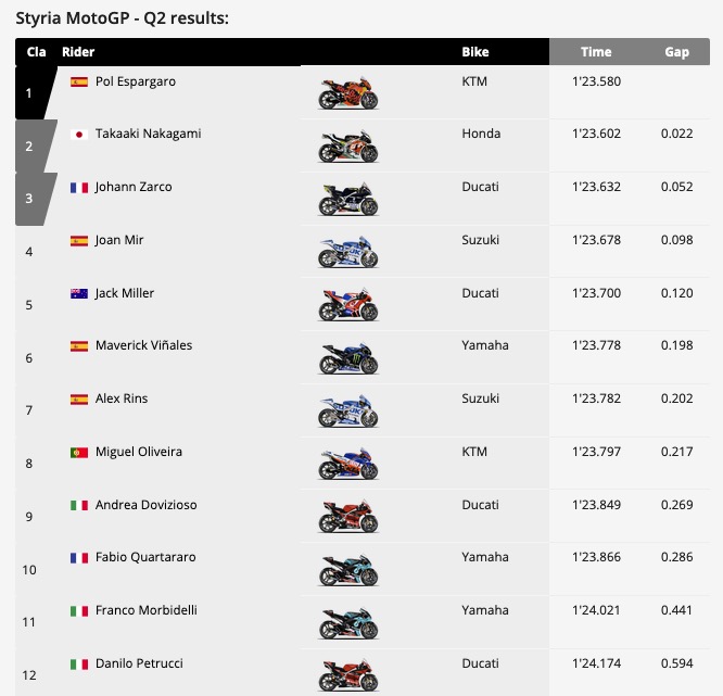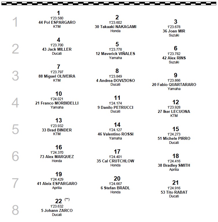 Ο Φάμπιο Κουαρταραρό προσπλαθησε να βρει τον καλό εαυτό του, ο Νακαγκάμι κράτησε τη σημαία της Honda ψηλά και οι ανανεωμένες ΚΤΜ έδειξαν τα δόντια τους. Και φυσικά έχουμε και τις εργοστασιακές Yamaha που βασανίζονται από προβλήματα στον κινητήρα. Με τον Βινιάλες να προσπαθεί μόνος του στο Q2 αφού όπως είπαμε ο Βαλεντίνο έπεσε στο Q1.