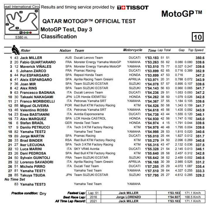 Κουαρταραρό, Βινιάλες, Ζαρκό και Πολ Εσπαργκαρό μπήκαν στην πεντάδα, ενώ Αλέιξ Εσπαργκαρό, Ζοάν Μιρ, Άλεξ Ρινς, Πέκο Μπανάια και Τακάκι Νακαγκάμι συμπληρώνουν τη δεκάδα. Ο Βαλεντίνο Ρόσι βρίσκεται στη 13η θέση, δύο θέσεις πίσω από τον ομόσταυλό του (Μορμπιντέλι), αλλά σημαντικά βελτιωμένος από τις πρώτες δοκιμές στο Κατάρ.