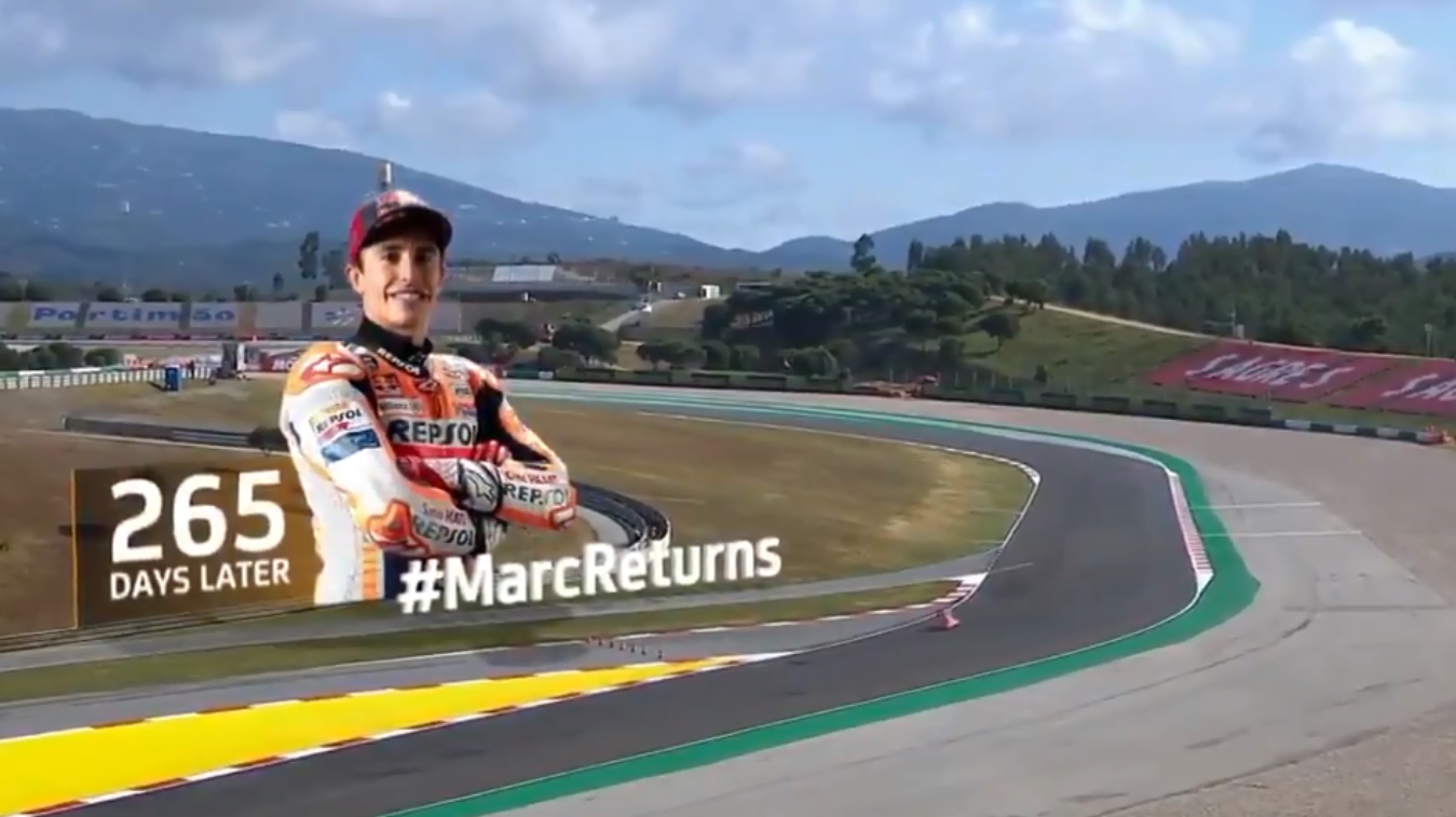 Η πρώτη περίοδος ελεύθερων δοκιμών των γκραν πρι της Πορτογαλίας σηματοδότησε την επιστροφή στο MotoGP, μετά 265 ημέρες, του έξι φορές παγκόσμιου πρωταθλητή Μαρκ Μάρκεθ με τη Honda, μετά από ένα σοβαρό κάταγμα που υπέστη στο χέρι, στον περσινό αγώνα της Χερέθ.