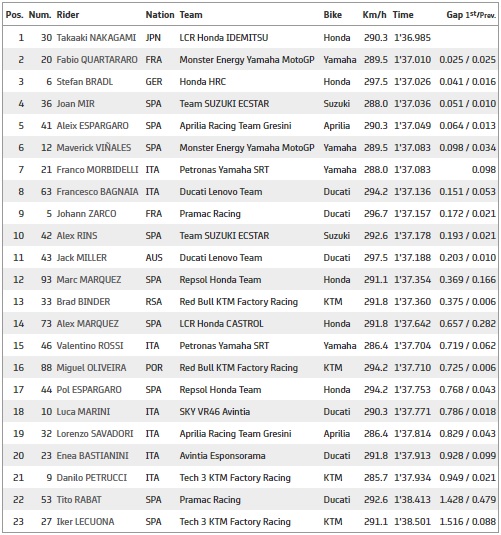 Κατά τα λοιπά, ο Τακάκι Νακαγκάμι ήταν ο πιο γρήγορος αναβάτης στην τρίτη περίοδο των ελεύθερων δοκιμαστικών. O Φάμπιο Κουαρταραρό τον ακολουθεί στη δεύτερη θέση, ενώ τρίτος είναι ο Στεφαν Μπραντλ, με πολύ μικρή διαφορά στο χρόνο. Η τέταρτη και η πέμπτη θέση ανήκει στον Ζοάν Μιρ και τον Αλέιξ Εσπαργκαρό αντίστοιχα, ενώ Μάβερικ Βινιάλες, Φράνκο Μορμπιντέλι, Πέκο Μπανάια, Ζουάν Ζαρκό και Άλεξ Ρινς κλείνουν τη δεκάδα.