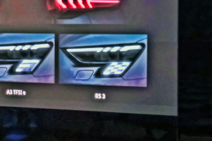 Το κιβώτιο ταχυτήτων θα είναι ένα αυτόματο διπλού συμπλέκτη S-Tronic το οποίο με τη σειρά του θα δίνει την κίνηση και στους τέσσερις τροχούς, αφού παραδοσιακά όλα τα Audi RS εφοδιάζονται με το σύστημα Quattro της εταιρείας. Ένα ενδιαφέρον χαρακτηριστικό που βγήκε στη δημοσιότητα για το RS3 είναι ότι χαμηλά, στα φώτα ημέρας LED, θα σχηματίζεται η καρό σημαία δίνοντας μια επιπλέον σπορ νότα στο εμπρός του τμήμα. Η σχετική φωτογραφία που αποκάλυψε τη συγκεκριμένη είδηση διέρρευσε στο διαδίκτυο και ακολουθεί ακριβώς από κάτω.