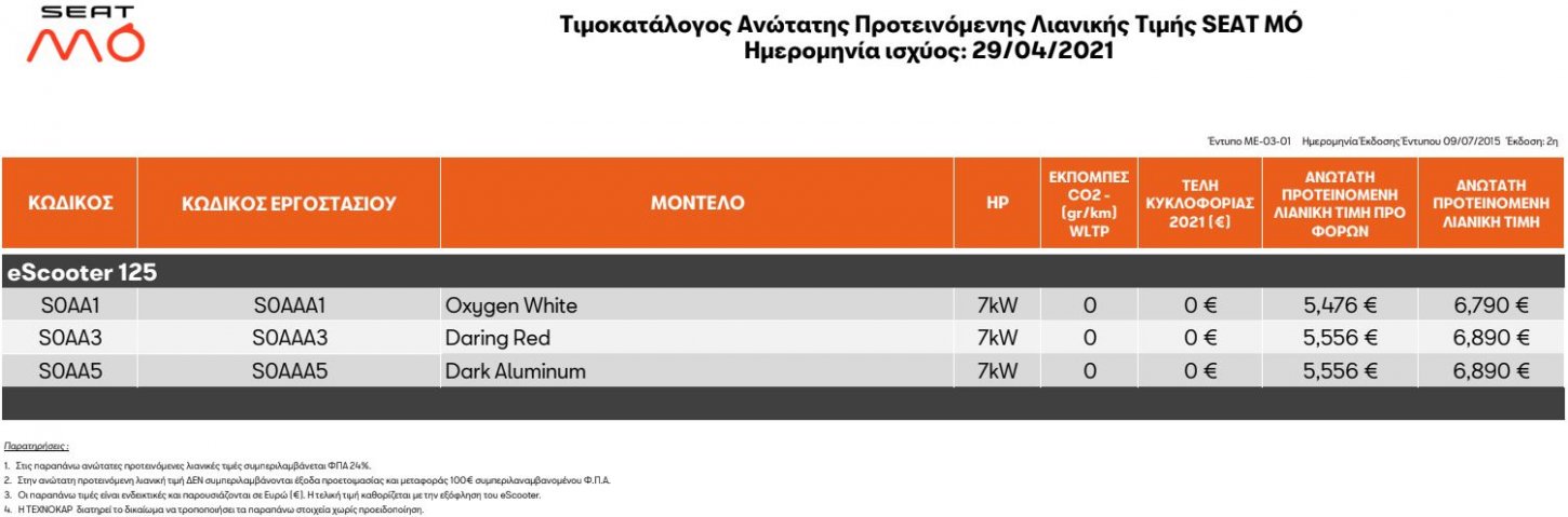 Στην Ελλάδα η δραστηριότητα της Seat MÓ θα ξεκινήσει από την 1η Ιουνίου 2021. Το πρώτο διαθέσιμο όχημα θα είναι το SEAT MÓ eScooter 125, στις τιμές που μπορείτε να δείτε παρακάτω.