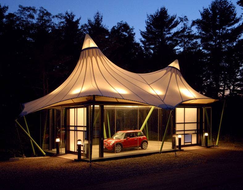 Κατασκευασμένο σαν μια γυάλινη σκηνή, αυτό το γκαράζ έχει σχεδιαστική άποψη. Βλέπουμε μέσα σε αυτό ένα κόκκινο MINI Cooper S όμως υπολογίζοντας «με το μάτι», χωράει ένα, ή δύο αυτοκίνητα ακόμη.