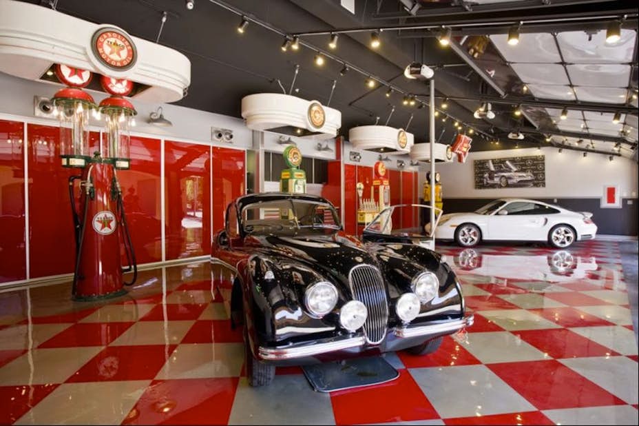Το θέμα αυτού του γκαράζ είναι ένα ρετρό βενζινάδικο, κρίνοντας από τις ψεύτικες vintage αντλίες στο πίσω μέρος και τις ταμπέλες. Όμορφο, μεγάλο και... πεντακάθαρο σαν χειρουργείο! Ιδανικό για τα δύο ιδιαίτερα αυτοκίνητα που φιλοξενεί.