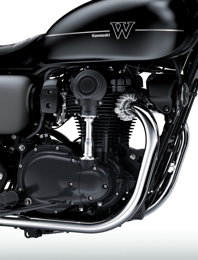 H W800 αποτελεί την αναβίωση αυτής της κληρονομιάς. Η νεότερη ιστορία της σειράς W ξεκίνησε με την αυγή της νέας χιλιετίας και το μοντέλο W650, το οποίο στην πορεία έγινε 800 και πλέον η απλή εκδοχή με την ονομασία street συνοδεύεται και από μια cafe racer, με «μπικίνι» φέρινγκ, απομίμηση μονόσελου και στενό τιμόνι να μεταλλάσουν την εικόνα προς πιο σπορ πλευρά. Ο δικύλινδρος, αερόψυκτος κινητήρας τόσο της street όσο και της cafe εκδοχής αποδίδει 48 ίππους από 773 κ.εκ. χωρητικότητας κυλίνδρων και είναι υποτετράγωνος, κάτι που προδίδει τη διάθεσή σου να αποδίδει στις χαμηλές στροφές λειτουργίας, εξασφαλίζοντας επαρκή ροπή 63 Nm στις 4.800 σ.α.λ. Οι αναρτήσεις, χωρίς ρυθμίσεις, ακολουθούν τη λογική διαστάσεων της δεκαετίας του 60, όπως και οι τροχοί, που φέρουν ελαστικά πλάτους 100 και 130 χιλ. εμπρός και πίσω αντίστοιχα. Τα φρένα περιλαμβάνουν δίσκους εμπρός και πίσω με δαγκάνες δύο εμβόλων και είναι επαρκή για τις επιδόσεις της W800.