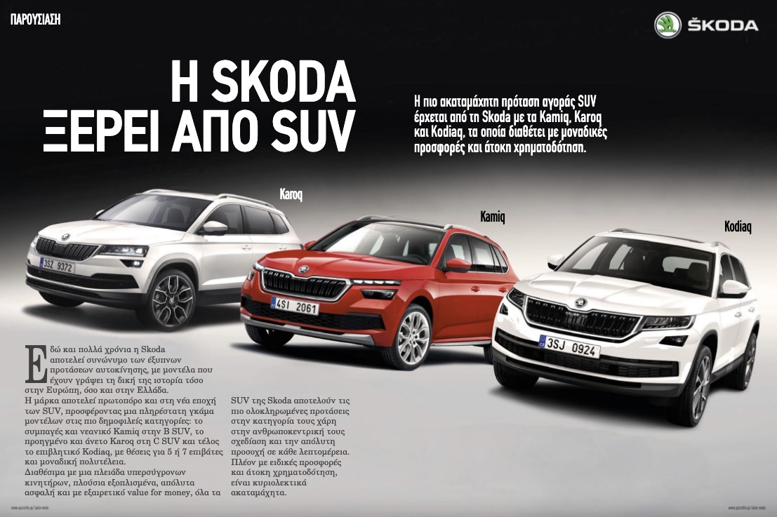 Η μάρκα αποτελεί πρωτοπόρο και στη νέα εποχή των SUV, προσφέροντας μια πληρέστατη γκάμα μοντέλων στις πιο δημοφιλείς κατηγορίες: το συμπαγές και νεανικό Kamiq στην B SUV, το προηγμένο και άνετο Karoq στη C SUV και τέλος το επιβλητικό Kodiaq, με θέσεις για 5 ή 7 επιβάτες και μοναδική πολυτέλεια. Διαθέσιμα με μια πλειάδα υπερσύγρονων κινητήρων, πλούσια εξοπλισμένα, απόλυτα ασφαλή και με εξαιρετικό value for money, όλα τα SUV της Skoda αποτελούν τις πιο ολοκληρωμένες προτάσεις στην κατηγορία τους χάρη στην ανθρωποκεντρική τους σχεδίαση και την απόλυτη προσοχή σε κάθε λεπτομέρεια. Πλέον με ειδικές προσφορές και άτοκη χρηματοδότηση, είναι κυριολεκτικά ακαταμάχητα.