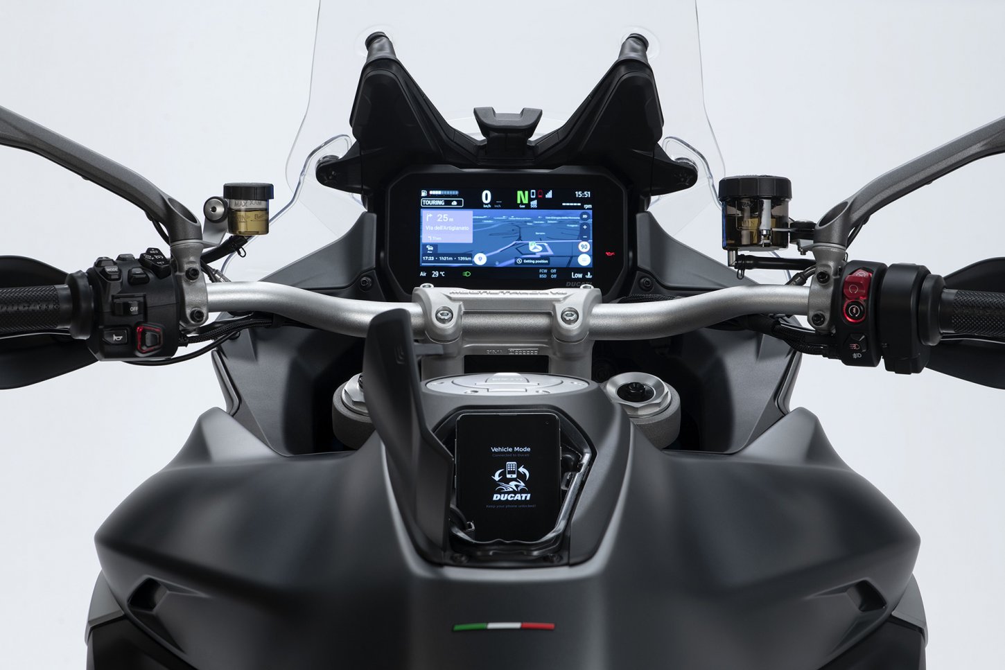 Το πακέτο ηλεκτρονικών συστημάτων της Multistrada V4 είναι η τελευταία λέξη της τεχνολογίας στις μοτοσυκλέτες για ασφάλεια, άνεση, απόδοση και συνδεσιμότητα. Η IMU πλατφόρμα διαχειρίζεται όλα τα κορυφαία συστήματα : Cornering ABS , Ducati Wheelie Control (DWC), Ducati Traction Control (DTC), Ducati Cornering Lights (DCL).