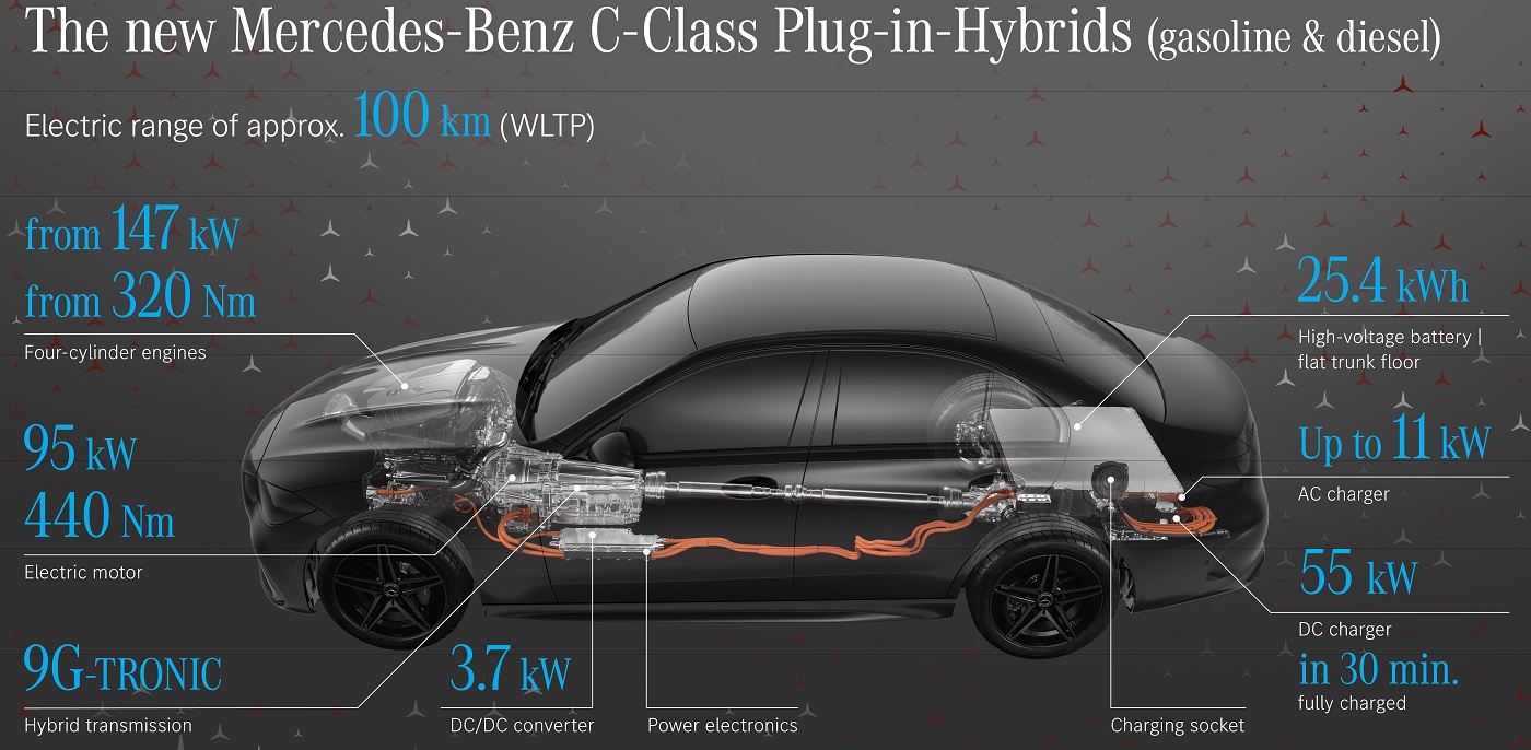 Μηχανολογικά η νέα C-Class ανεβάζει και πάλι ψηλά τον πήχη για τον ανταγωνισμό. Οι κινητήρες βενζίνης και diesel είναι πλέον τετρακύλινδροι, όλοι με ηλεκτρική υποβοήθηση ISG, δηλαδή ήπια υβριδικοί. Plug-in υβριδικές εκδόσεις θα ακολουθήσουν σύντομα, τόσο με κινητήρες βενζίνης όσο και diesel, με κυρίαρχο χαρακτηριστικό τους την ικανότητα κίνησης αμιγώς ηλεκτρικά για απόσταση που θα φτάνει στα 100 χιλιόμετρα.