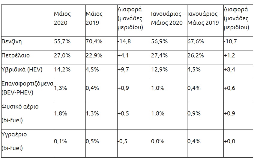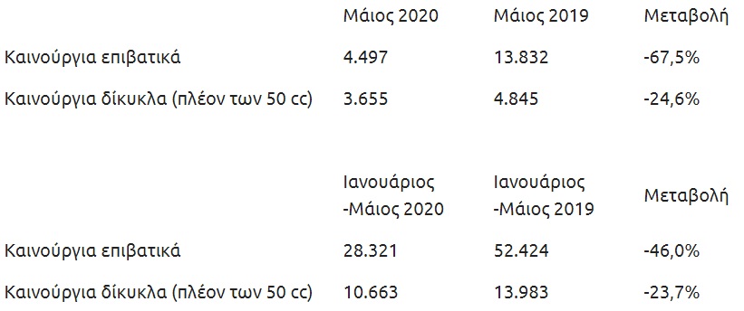 Όσον αφορά στον όγκο των επιβατικών αυτοκινήτων που ταξινομήθηκαν το Μάιο ήταν 4.497 μονάδες, αντί 13.832 τον ίδιο μήνα πέρυσι. Σε βάθος πενταμήνου, ο αριθμός των νέων αυτοκινήτων που ταξινομήθηκαν το 2020 ήταν 28.321, αντί 52.424 το ίδιο διάστημα του 2019.