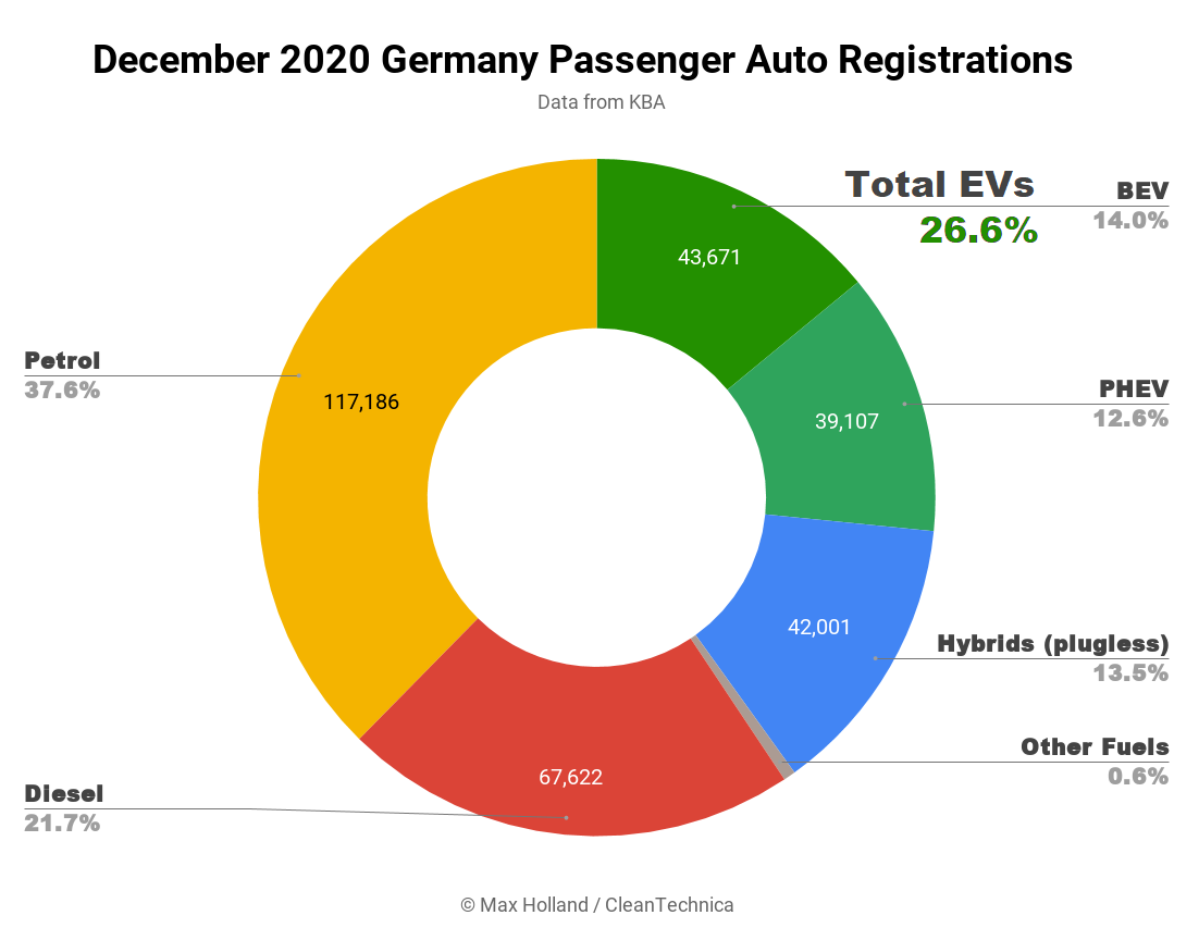Ακριβώς το ίδιο συνέβη και στην τεράστια γερμανική αγορά, όπου οι συνδυασμένες πωλήσεις αμιγώς ηλεκτρικών μοντέλων μπαταρίας και plug-in υβριδικών ξεπέρασαν σε ποσοστό το 26,6% των συνολικών πωλήσεων και βρέθηκαν αρκετά πάνω από τα μοντέλα με κινητήρες diesel.