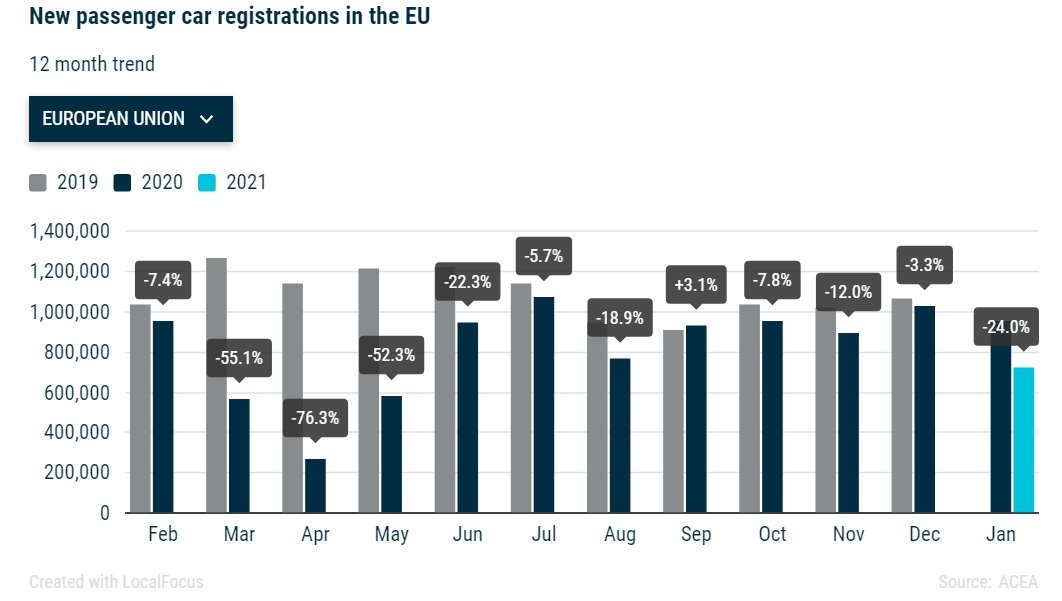 Τον Ιανουάριο του 2021, η αγορά επιβατικών αυτοκινήτων της Ε.Ε. σημείωσε σημαντική πτώση, καθώς οι περιορισμοί που σχετίζονται με την COVID-19 συνέχισαν να επηρεάζουν σημαντικά τις πωλήσεις. Επιπλέον, πολλές αγορές είχαν μία εργάσιμη ημέρα λιγότερη από ό, τι τον Ιανουάριο του 2020. Αυτό το αρνητικό αποτέλεσμα είχε επίσης σαφές αντίκτυπο στις ταξινομήσεις του περασμένου μήνα.