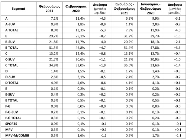 8,8% κέρδος έχει μόνο η κατηγορία των επαγγελματικών, ελαφρών και βαρέων, ενώ -57,4% βρίσκεται η αγορά στα νέα λεωφορεία. Η κατηγορία των μοτοσικλετών εμφανίζει επίσης απώλειες σε επίπεδο διμήνου, κάτι που δείχνει ότι ο Ιανουάριος του 2021 ήταν αρκετά πιο κακός σε σχέση με τον Φεβρουάριο.
