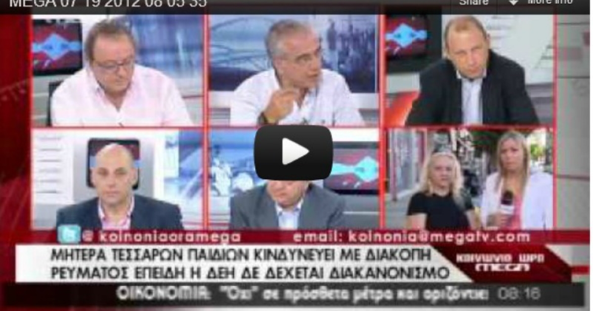 Ξέσπασε μία μητέρα τεσσάρων παιδιών η οποία μιλώντας στην πρωινή εκπομπή του Μέγκα κατέρρευσε συναισθηματικά καθώς όπως τόνισε δεν έχει χρήματα να πληρώσει το χαράτσι της ΔΕΗ. Συγκλονιστική και η μαρτυρία νεφροπαθούς που δεν έχει δυνατότητα να κάνει αιμοκάθαρση.