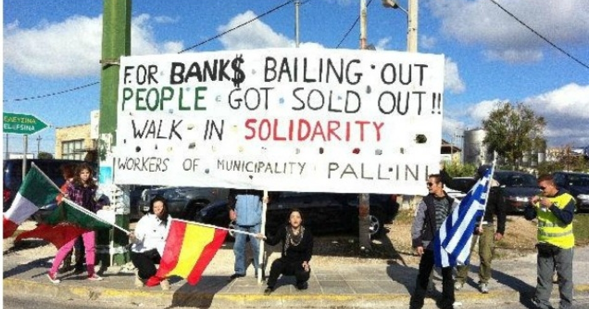 Η πρώτη φωτογραφία είναι από την Παλλήνη, από διαμαρτυρία των εργαζόμενων του δήμου. «Σώζετε τις τράπεζες, πουλάτε τους ανθρώπους» έγραψαν σε πλακάτ την ώρα που οι μαραθωνοδρόμοι περνούσαν από κεντρικό δρόμο της περιοχής.