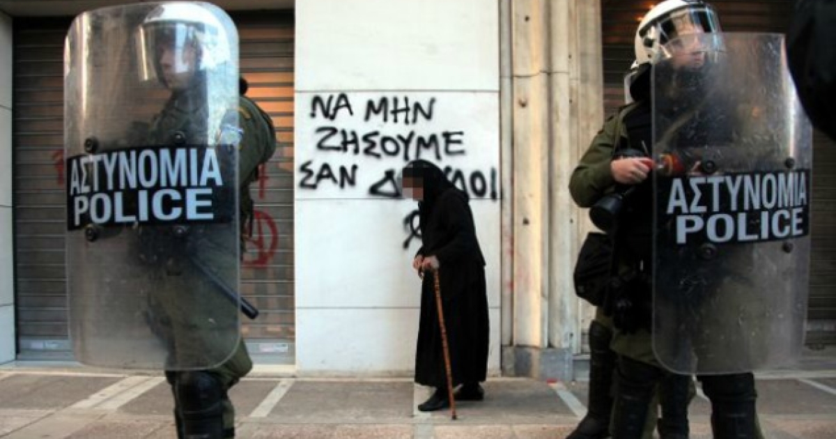 Αστυνομικοί των ΜΑΤ βρίσκονται με τις ασπίδες στα χέρια. Πίσω τους, στον τοίχο ενός κτιρίου είναι γραμμένο το σύνθημα «Να μη ζούμε σαν δούλοι».