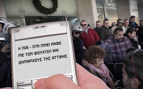 Η ΠΟΕ - ΟΤΑ ενημέρωσε τα μέλη της για την αιφνίδια κινητοποίησή της με ένα μάλλον σιβυλλικό SMS που έγραφε «Η ΠΟΕ - ΟΤΑ πίνει καφέ με τον Φούχτελ και Δημάρχους της Αττικής».