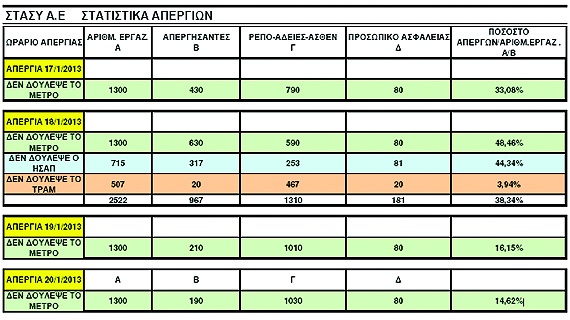 Οι εργαζόμενοι στο μετρό, για παράδειγμα, οι οποίοι αντιδρούν στην ένταξή τους στο ενιαίο μισθολόγιο μαζί με όλους τους άλλους υπαλλήλους του δημόσιου τομέα, ξεκίνησαν από την Πέμπτη απεργία διαρκείας, αλλά όπως προκύπτει από τα στοιχεία της ΣΤΑΣΥ Α.Ε. κατά την πρώτη ημέρα απεργίας (Πέμπτη 17/1) από τους 1.300 εργαζόμενους του μετρό το ημερομίσθιο έχασε μόνο το 33%, δηλαδή 430 άτομα. Οι υπόλοιποι 790 αρρώστησαν ξαφνικά και μαζικά, πήραν άδειες ή ρεπό και 80 ήταν προσωπικό ασφαλείας. Στις 18/1 από τους 507 εργαζόμενους του τραμ απήργησαν μόνο οι 20 (3,94%!), καθώς 467 αρρώστησαν, πήραν ρεπό ή άδεια και 20 ήταν προσωπικό ασφαλείας. Στις 19/1: Σε σύνολο 1.300 εργαζομένων του μετρό απήργησαν 210 άτομα, ενώ 1.010 αρρώστησαν και πάλι μαζικά, πήραν άδειες και ρεπό και 80 μπήκαν προσωπικό ασφαλείας. Δηλαδή, μόνο το 16,15% των «απεργών» έχασε το μισθό του. Εντυπωσιακότερα τα στοιχεία της τέταρτης ημέρας (20/1) κατά την οποία 190 έχασαν το ημερομίσθιο, τη στιγμή που 1.030 εμφανίστηκαν ασθενείς ή αδειούχοι και 80 προσωπικό ασφαλείας. Το ποσοστό, δηλαδή, των πραγματικών απεργών ήταν μόλις το 14,62% του συνόλου.