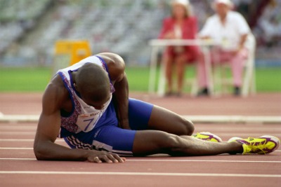 Πριν από την κούρσα του τελικού οι κάμερες έκαναν διαρκώς ζουν στο πρόσωπο του. Ηταν ο σούπερ σταρ στα 400 μ. Ξεκίνησε δυνατά, ανέβαινε, μα στα 280 μέτρα ένιωσε την χειρότερη αίσθηση της ζωής του όλης. Το κρακ είχε ως αφετηρία τον δεξί μηριαίο (σ.σ.: δικέφαλος), διαπέρασε το κορμί, τον εγκέφαλο και έφτασε μέχρι την καρδιά που ράγισε. Ηταν θλάση. Του είχε κοπεί ο μυς και κατέρρευσε.