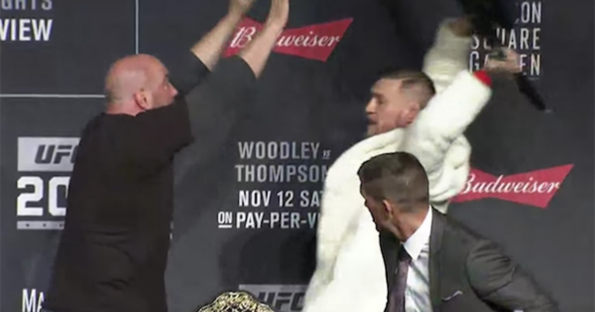 Φωτιά έβαλαν στο UFC 205 της Νέας Υόρκης οι ΜακΓκρέγκορ και Άλβαρεζ, καθώς στην συνέντευξη Τύπου, λίγο έλειψε να τα κάνουν... γυαλιά καρφιά. Ο δεύτερος, ξεκίνησε τον «χαμό» προκαλώντας τον αντίπαλό του, που φυσικά δεν ήθελε και πολύ να αντιδράσει! Ο Άλβαρεζ έριξε μία καρέκλα, ο ΜακΓκρέγκορ πήγε να πετάξει την δική του και ο μεταξύ τους αγώνας, απέκτησε ακόμα μεγαλύτερο ενδιαφέρον.
