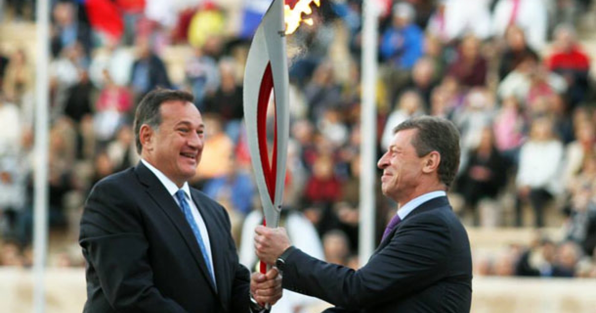 Παρουσία του Προέδρου της Δημοκρατίας κ. Κάρολου Παπούλια, η Ολυμπιακή Φλόγα παραδόθηκε από τον Πρόεδρο της Ελληνικής Ολυμπιακής Επιτροπής κ. Σπύρο Καπράλο στον Αναπληρωτή Πρωθυπουργό της Ρωσίας κ. Ντμίτρι Κάζακ που ήταν επικεφαλής της ρωσικής αποστολής, αρχίζοντας έτσι και επίσημα το ταξίδι της μέχρι το Σότσι.