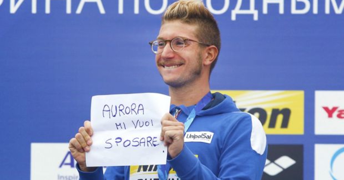 Ο Ιταλός κολυμβητής ανέβηκε στο ψηλότερο σκαλί του βάθρου στο αγώνισμα της μαραθώνιας κολύμβησης 25χλμ. (με χρόνο 4:53.10.7) και με ένα χαμόγελο ζωγραφισμένο στο πρόσωπο του απ' άκρη σ' άκρη στράφηκε προς το έτερον ήμισυ στην εξέδρα κράτησε μία λευκή σελίδα στην οποία είχε γράψει «Αουρόρα θελεις να με παντρευτείς;»