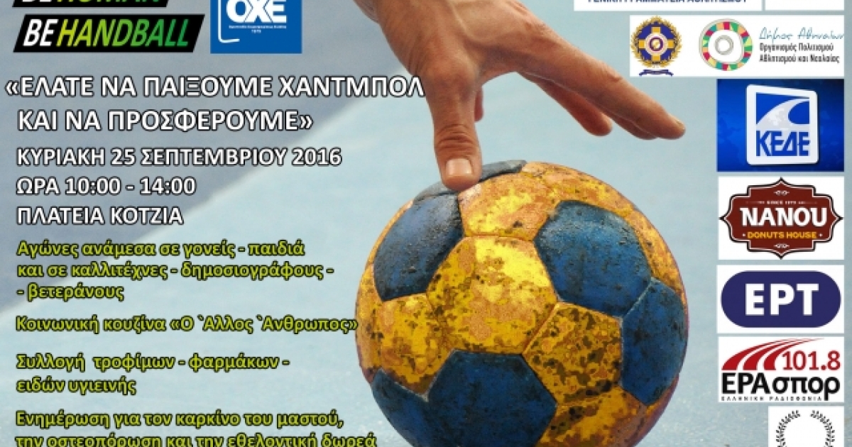 Με το σύνθημα «Ελάτε να παίξουμε χάντμπολ και να προσφέρουμε» η Ομοσπονδία Χειροσφαιρίσεως Ελλάδος καλεί όλα τα σωματεία, τους αθλητές, τους προπονητές και γενικά όλους τους συντελεστές του αθλήματος να δώσουν δυναμικό «παρών» στην πλατεία Κοτζιά την Κυριακή 25 Σεπτεμβρίου (10:00-14:00).