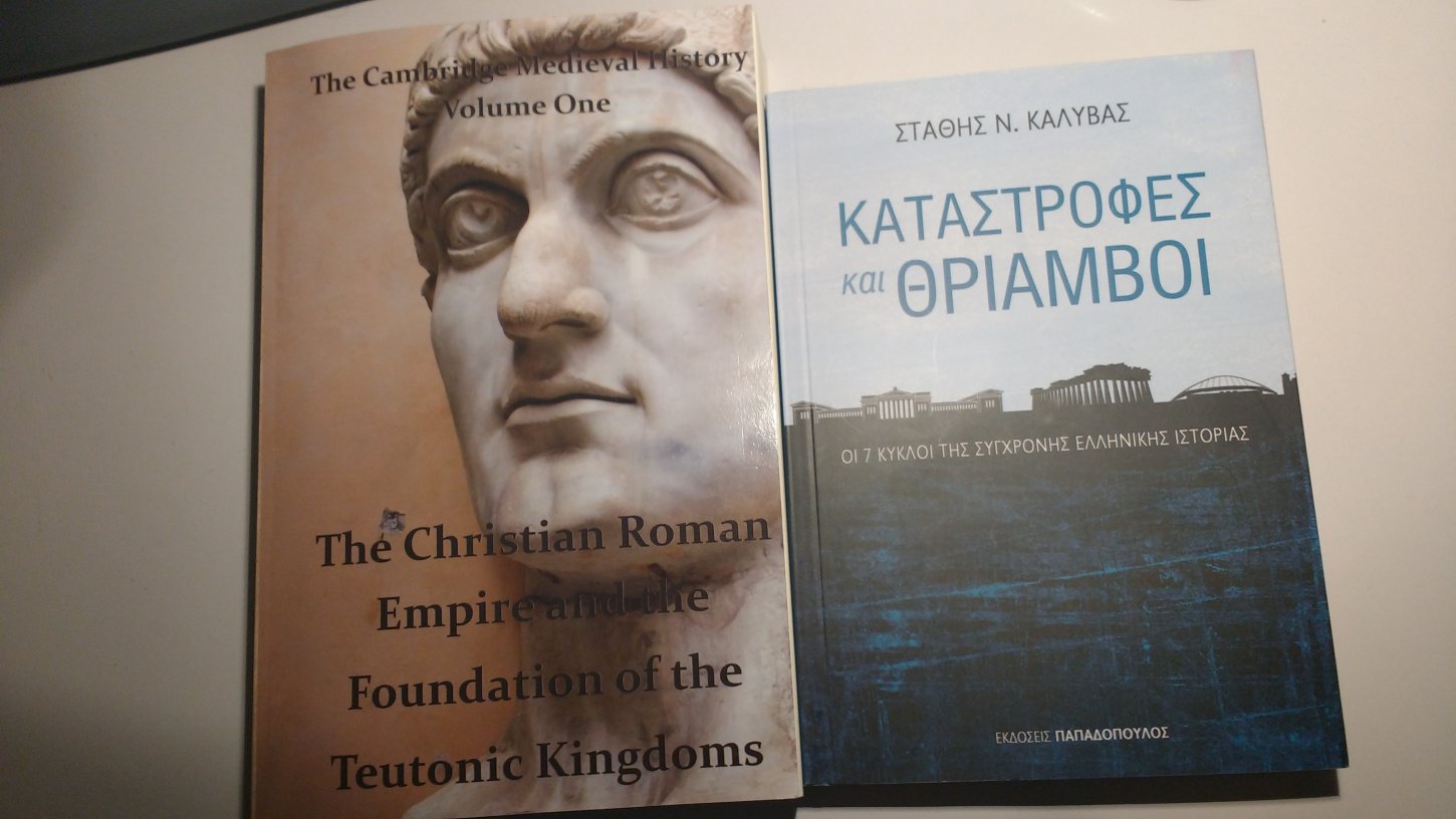 Τα δύο βιβλία που βρίσκονται στο κομοδίνο μετά τις γιορτές είναι το Καταστροφές και Θρίαμβοι του Στάθη Ν. Καλύβα και το The Cambridge Medieval History : The Christian Roman Empire and the Teutonic Kingdoms, του J.C Bury. Για την ακρίβεια μόνο το δεύτερο αφού το βιβλίο του Καλύβα ήταν δουλειά 48 ωρών.