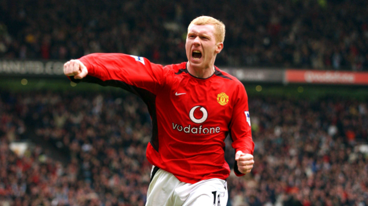 Όπως ο Γκιγκς, έτσι και ο Σκόουλς δεν αγωνίστηκε ποτέ του σε άλλη ομάδα, εκτός της Μάντσεστερ Γιουνάιτεντ. Έκανε ντεμπούτο στην Πρέμιερ Λιγκ στις 24 Σεπτεμβρίου 1994, σε ένα παιχνίδι που η ομάδα του έχασε με 3-2 από την Ίπσουιτς, όμως ο ίδιος βρήκε δίχτυα. Στις 6 Μαρτίου 2010, ο Σκόουλς έδωσε τη νίκη στην Γιουνάιτεντ με 1-0 κόντρα στην Γούλβς, φτάνοντας τα 100 τέρματα στο πρωτάθλημα. Το κοντέρ σταμάτησε στα 107, στη δεύτερη θητεία του στην ομάδα. Συγκεκριμένα, βρήκε δίχτυα στις 15/9/2012, σε ένα 4-0 επί της Γουίγκαν.