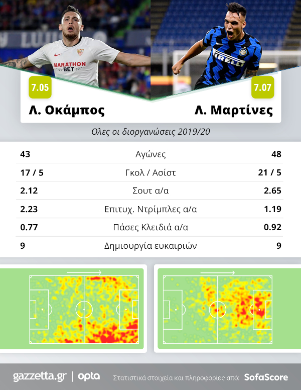 Συνολικά, στη μεταξύ τους σύγκριση με τη βοήθεια του SofaScore, βλέπουμε πως ο Λαουτάρο υπερέχει στο κομμάτι της παραγωγικότητας, με πλεόνασμα τεσσάρων γκολ σε πέντε περισσότερες συμμετοχές. Ο Οκάμπος, όμως, δεν πρέπει να ξεχνάμε πως είναι κατά βάση εξτρέμ, άλλο αν απειλεί τόσο στο ψηλό παιχνίδι από στημένες φάσεις (1,85 ύψος γαρ, το απέδειξε και με το νικητήριο γκολ απέναντι στη Γουλβς) και πατάει όσο το δυνατόν περιοχή.