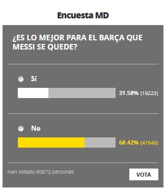 Στις δυο σήμερα (05/09) τα ξημερώματα, οι απαντήσεις ήταν σοκαριστικές σε γκάλοπ στην ιστοσελίδα της κυβερνητικής (στο πλευρό της διοίκησης, δηλαδή) εφημερίδας «Mundo Deportivo» με ερώτημα: «Είναι το καλύτερο για την Μπάρτσα ότι ο Μέσι μένει;».