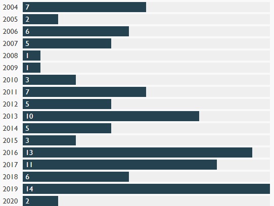 Αζερμπαϊτζάν, Βοσνία, Καμερούν, Κύπρος, Τσεχία, Αύγυπτος, Καζακστάν, Σαουδική Αραβία | 2 |