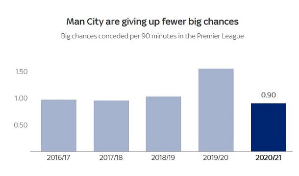Η Σίτι εκμεταλλεύεται καλύτερα την κατοχή και, παρ' ότι πιέζει λιγότερο σε σχέση με τα προηγούμενα χρόνια (το παρακάτω γράφημα αποτυπώνει τις πάσες που επιτρέπει στον αντίπαλο σε κάθε αμυντική φάση, κατά μέσο όρο), δέχεται πολύ λιγότερα γκολ.
