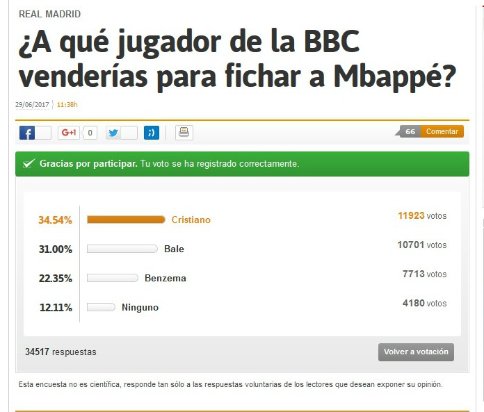 Κάπως έτσι και στην «As» αναρωτήθηκαν ποιον θα έπρεπε να πουλήσει η ομάδα, για ν' αγοράσει τον Μπαπέ. Το ερώτημα φυσικά το έθεσαν και στους αναγνώστες τους. Εριξαν τέσσερις επιλογές, ώστε να μετρήσουν τον παλμό του κόσμου. Ρονάλντο, Μπέιλ, Μπενζεμά ή κανένας; Και μόνο όμως που μπήκε στην κουβέντα το όνομα του σούπερ σταρ των Μερένγκες, θα μπορούσε ν' αποτελεί από μόνο του πρόκληση, ίσως και ύβρη. Και κάπου εκεί είναι όμως που έγινε η ανατροπή...