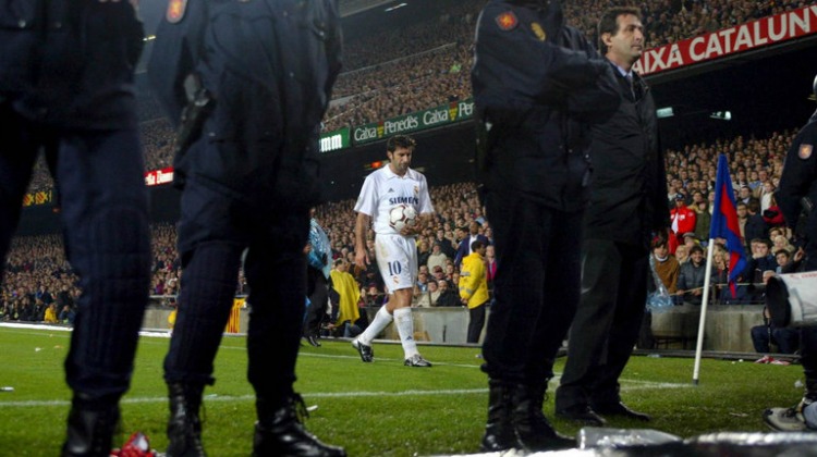 Πρόκειται για τη μεγαλύτερη «προδοσία» ποδοσφαιριστή στη σύγχρονη ιστορία. Η μετακίνησή του από την Μπαρτσελόνα στην Ρεάλ Μαδρίτης το καλοκαίρι του 2000 προκάλεσε «σεισμό» στην Ισπανία. Στην ιστορία έχει μείνει η πρώτη του επίσκεψη στο Καμπ Νου ως αντίπαλος, τον Οκτώβριο του 2000, όταν ο Φίγκο έγινε αποδέκτης της μήνης των οπαδών των «μπλαουγκράνα». Οι αποδοκιμασίες ήταν εκκωφαντικές κατά την είσοδό του στον αγωνιστικό χώρο, αλλά και κάθε φορά που γινόταν αποδέκτης της μπάλας. Από την εξέδρα εκτοξεύονταν κάθε λογής αντικείμενα, από μπουκάλια μέχρι... γουρουνοκεφαλές! Και μπορεί στο συγκεκριμένο παιχνίδι να έφυγε με σκυμμένο το κεφάλι (νίκη της Μπαρτσελόνα με 2-0) όμως στο φινάλε της σεζόν, ο Πορτογάλος ήταν αυτός που χαμογέλασε, καθώς κατέκτησε με την Ρεάλ την Πριμέρα Ντιβιζιόν.