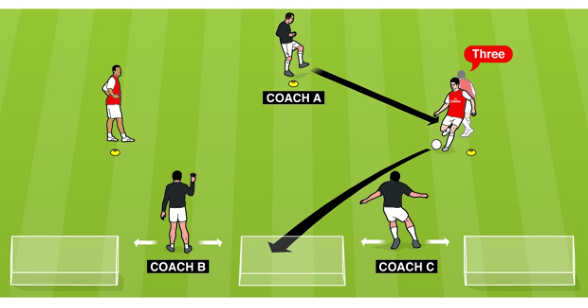 Αυτή είναι μια άσκηση την οποία κάναμε στη Barcelona. Ο προπονητής Α πασάρει είτε στον παίκτη Α ή στον Β ο οποίος πρέπει να βρίσκεται σε πλήρη ετοιμότητα. Εάν ο προπονητής Α δώσει πάσα στον παίκτη Β τότε αυτός πρέπει να κοιτάζει αμέσως προς τους προπονητές Β και C και να δει πόσα δάχτυλα έχουν υψωμένα. Τότε πρέπει να γυρίσει αυτομάτως προς τον προπονητή Α και να του φωνάζει τον αριθμό των δακτύλων πριν ακόμα λάβει τη μπάλα. Στη συνέχεια και αμέσως μόλις πάρει την πάσα πρέπει να κάνει κοντρόλ και να σουτάρει σε ένα από τα τρία κενά μίνι τέρματα. Εν τω μεταξύ οι προπονητές την πλευρά τους ή ακόμα να πιέσουν τον παίκτη Β δημιουργώντας συνθήκες αγώνα. Επίσης οι προπονητές μπορούν και να καλύψουν τα τέρματα ούτως ώστε να του μειώσουν τις πιθανότητες να σκοράρει.