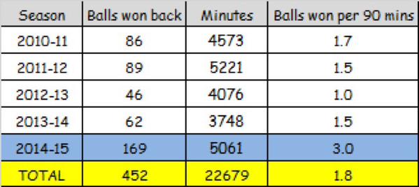 Ακόμα και υπό αυτές τις συνθήκες όμως ο Αργεντινός σούπερ σταρ κατάφερε να βρει τον τρόπο να συμμετάσχει σημαντικά στο παιχνίδι. Το πιο σπουδαίο που έκανε σε εκείνο το διάστημα, ήταν το να δίνει μονομαχίας και να παλεύει για να ξανακερδίσει μπάλες. Αυτό το τελευταίο μάλιστα φέτος το κάνει περισσότερο από κάθε άλλη σεζόν της καριέρας του, κάτι που φαίνεται στον πίνακα που ακολουθεί.