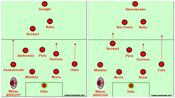 Δίπλα στους Γκατούζο-Πίρλο τοποθετήθηκε ένας ακόμα παίκτης με χαρακτηριστικά κόφτη, ο Μάσιμο Αμπροζίνι, και ο Ζέεντορφ πήγε πιο μπροστά για να γίνει παρτενέρ του Κακά πίσω από τον Πίπο Ιντζάγκι. Χωρίς να έχει πλέον Μαλντίνι-Καφού στα άκρα, η Μίλαν έκανε τη δουλειά με τους Μάρεκ Γιανκουλόφσκι (αριστερά) και Μάσιμο Οντο (δεξιά) και φτάνοντας μέχρι τον τελικό της Αθήνας πήρε την εκδίκηση που χρωστούσε στην Λίβερπουλ κατακτώντας το 70 Champions League στην ιστορία της.