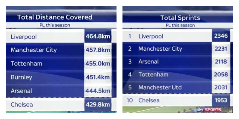 Παράλληλα, του δίνει τη δυνατότητα να δουλέψει με μικρότερο ρίσκο και να αντιμετωπίσει το ζήτημα της συσωρρευμένης κόπωσης που στηλίτευσε ο Φερχάιχεν. Θα έχει αποτέλεσμα; Θα φανεί κατά τη διάρκεια της χρονιάς σε απουσίες και φρεσκάδα. Σε αυτό το ξεκίνημα της κούρσας πάντως οι Ρεντς έχουν την ένταση, την ταχύτητα και τον ρυθμό που απαιτεί το gegenpressing και το επιθετικό πλάνο του Κλοπ. Η Λίβερπουλ, όπως φαίνεται και στις εικόνες που έφτιαξε το Skysports παραμονές του αγώνα με την Τσέλσι, είναι πρώτη σε συνολικά χιλιόμετρα και ξεχωριστά σπριντ.