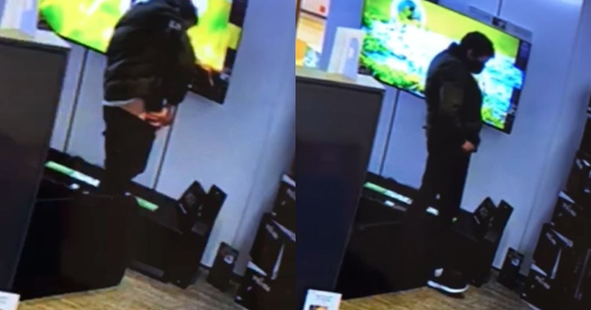 Το βίντεο δείχνει τον κλέφτη να σπρώχνει το ηχείο κάτω από το παντελόνι του και να προσπαθεί να κρύψει την άλλη άκρη του μέσα στο μπουφάν του. Ασφαλώς και η κρυψώνα του δεν ήταν η πιο πειστική και έτσι το προσωπικό του καταστήματος τον έπιασε προτού καταφέρει να φύγει.