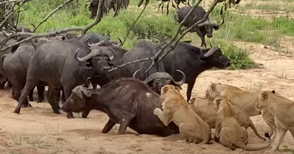 Εκεί λοιπόν 5 λιοντάρια αντιλαμβάνονται πως ένα κοπάδι βουβαλιών περνάει από κοντά τους και καταφέρνουν να πιάσουν ένα από αυτά, το οποίο αρχίζουν να δαγκώνουν την ώρα που έχει μείνει πίσω και είναι ανήμπορο να αντιδράσει.
