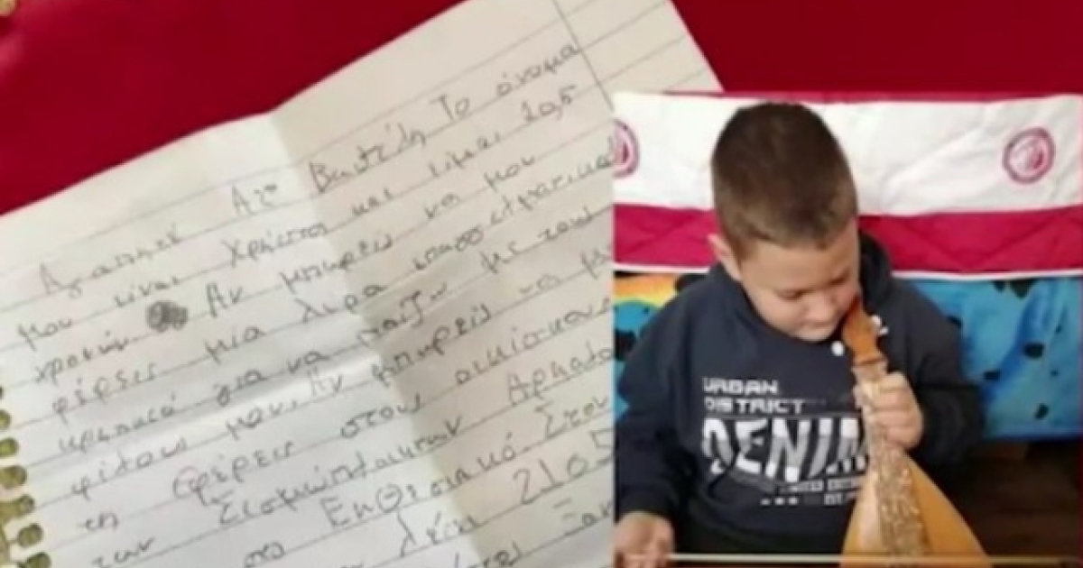 Συγκίνηση προκαλεί το γράμμα ενός 10χρονου από την Κρήτη, ο οποίος απευθυνόμενος στον Άγιο Βασίλη τού ζητά να του φέρει μία κρητική λύρα για να μπορεί να παίζει μουσική στους φίλους του.