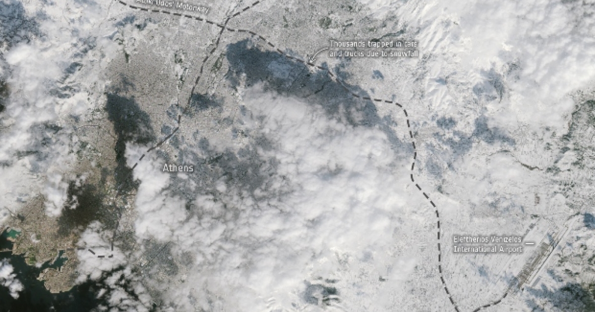 Η ESA επισημαίνει ότι «μια ασυνήθιστη χιονοκαταιγίδα σκέπασε τμήματα της Τουρκίας και της Ελλάδας, προκαλώντας διακοπές ρεύματος, χάος στους δρόμους και ματαιώσεις πτήσεων». Αναφέρει ακόμη ότι «πολύ χιόνι έπεσε στην ελληνική πρωτεύουσα για περισσότερες από 12 ώρες στις 24 Ιανουαρίου, αφήνοντας χιλιάδες οδηγούς αυτοκινήτων ακινητοποιημένους στην Αττική Οδό, με όσους δεν διασώθηκαν, να πρέπει να υπομείνουν θερμοκρασίες έως -14 βαθμούς, καθώς η νύχτα έπεφτε».
