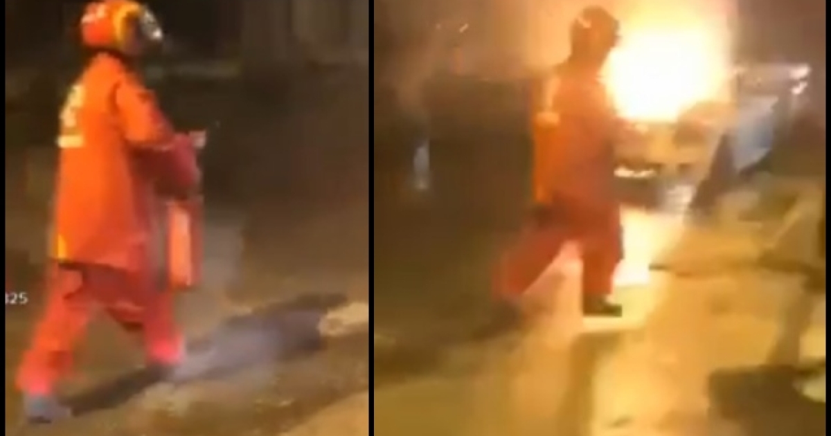 Λίγα μέτρα πιο μπροστά έχει σταματήσει ένας διανομέας, ο οποίος διακρίνεται στο video να έχει έναν πυροσβεστήρα στα χέρια του και να τρέχει να σβήνει την φωτιά.