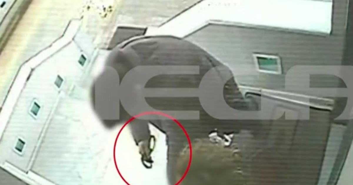 Ο άνδρας αυτός, φαίνεται στη κάμερα ότι στο δεξί του χέρι, κρατά χειροπέδες. Η γυναίκα δεν το έχει καταλάβει και συνεχίζει προς την είσοδο. Κρατά στα χέρια της τη τσάντα της, σακούλες και το κινητό της τηλέφωνο.