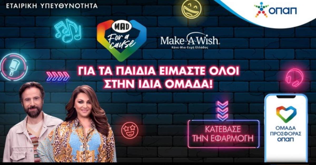 Με ένα δωρεάν download της εφαρμογής «Ομάδα Προσφοράς ΟΠΑΠ» ενισχύουμε την πρωτοβουλία “MAD for a Cause” και κάνουμε πραγματικότητα τις ευχές τεσσάρων παιδιών του Make-A-Wish (Κάνε-Μια-Ευχή Ελλάδος), που πάσχουν από σοβαρά νοσήματα. Παράλληλα, διεκδικούμε δύο δώρα εμπειρίας από την Καίτη Γαρμπή και τον Κωστή Μαραβέγια, οι οποίοι υποστηρίζουν αυτή την σημαντική πρωτοβουλία του ΟΠΑΠ για τα παιδιά.