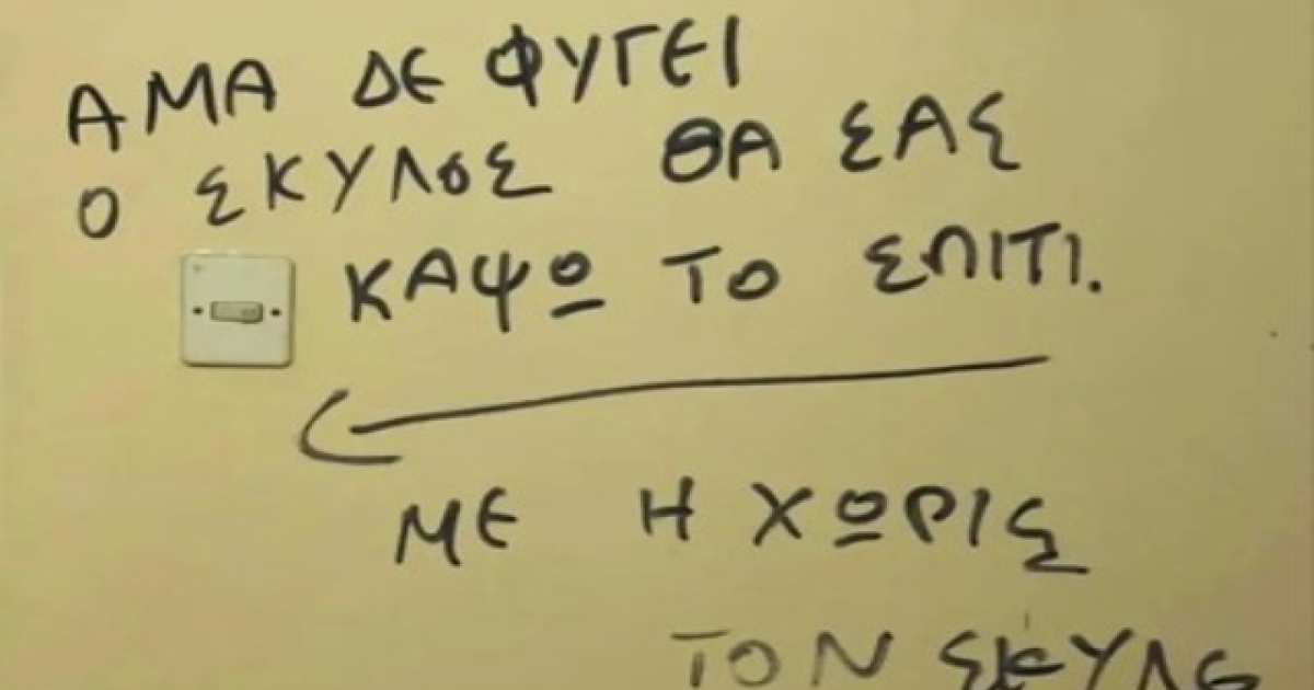 Ένα αδιανόητο και απειλητικό μήνυμα γραμμένο στο τοίχο έξω από την είσοδο του σπιτιού της, στην πολυκατοικία όπου διαμένει, βρήκε μια κοπέλα στην Θεσσαλονίκη επειδή έχει σκύλο!