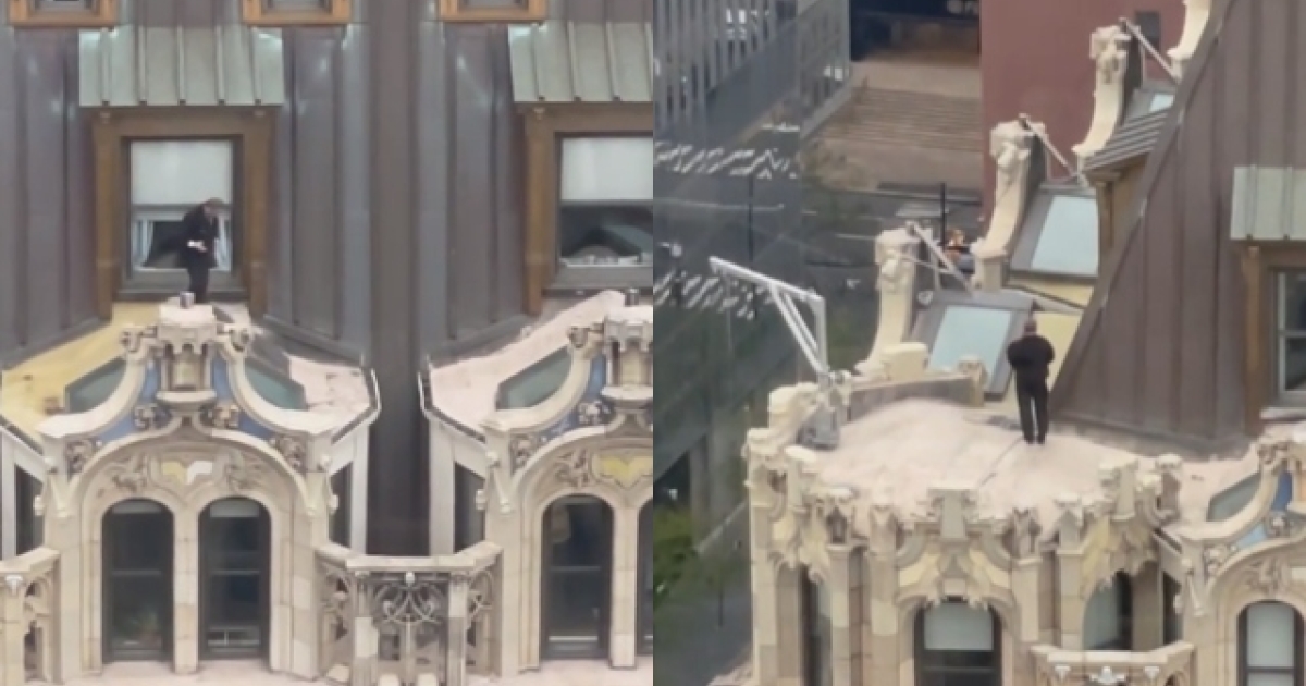 Ο άγνωστος άνδρας απεικονίζεται να τρέχει και να μιλάει στο τηλέφωνο και κατόπιν αρχίζει να τρέχει πηδώντας στις τέντες του κτηρίου, του οποίου το ύψος αγγίζει σχεδόν τα 99 μέτρα! Στη συνέχεια, ο μαυροφορεμένος άνδρας μπαίνει κρυφά στο κτήριο από ένα παράθυρο.