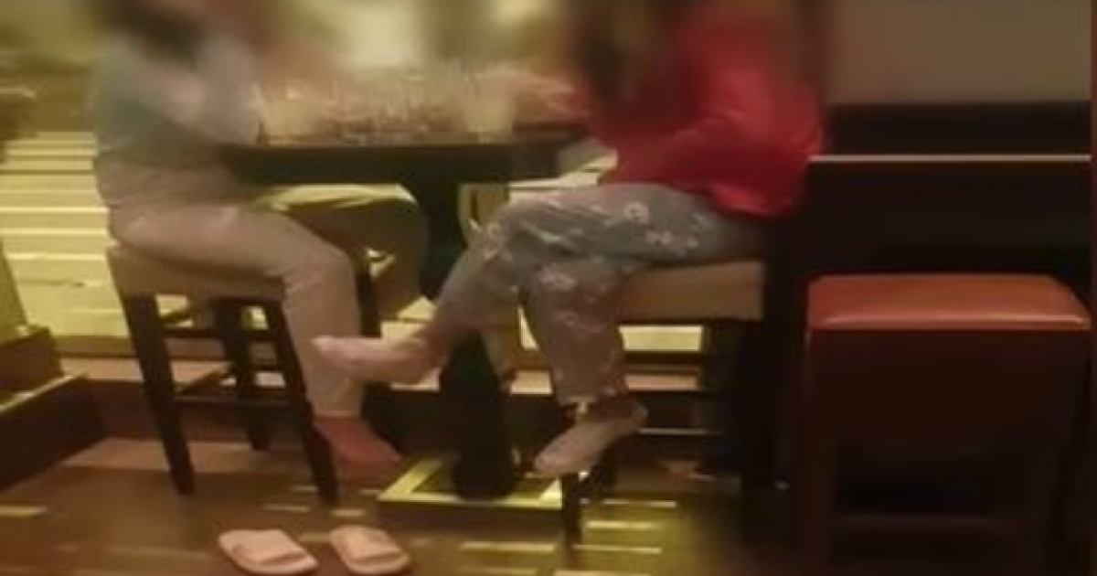 Οι δύο κοπέλες πιθανότατα τουρίστριες, αποφάσισαν να βγουν για ποτό χωρίς να χάσουν χρόνο για να επιλέξουν ρούχα. Έτσι εμφανίστηκαν στο μπαρ με τις πιτζάμες τους, ενώ η μία δεν μπήκε καν στη διαδικασία να βάλει παπούτσια, φορώντας απλώς τις παντόφλες της.